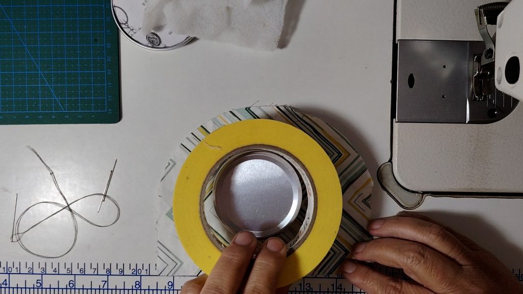 Place the tin onto the fabric and trace a circle that is about 2 to 2.5 cm bigger than the lid.