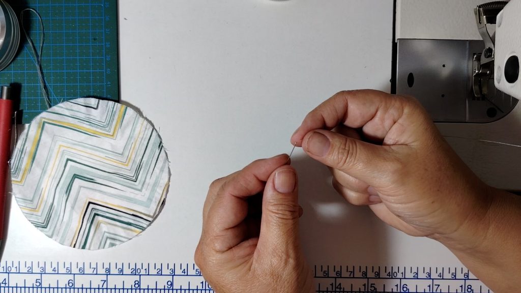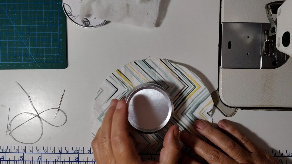 Sew a tacking stitch around the edge of the fabric circle: