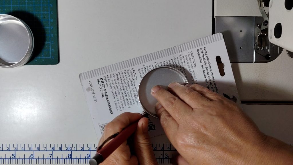 Place the tin lid onto the cardboard and carefully trace around the outside edge. This traced shape shows you exactly how big the pincushion base needs to be so that it fits neatly inside the lid.