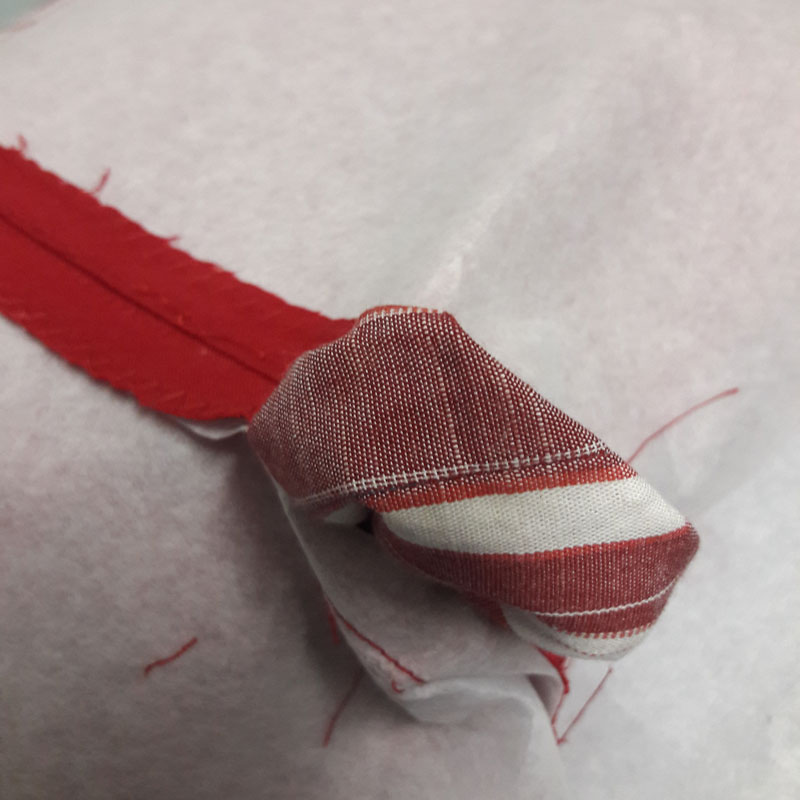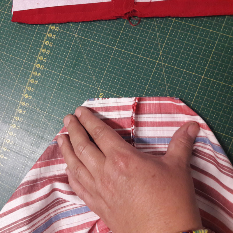 Lying the corner you have just cut flat on the table pull on both corner so that you end up with the seam on top , middle of the corner and pin carefully into place then sew at least 1cm from the edge that you have pined. Remember to backstitch stitch at the start and end of the sewing line. Do this to all the corners you have cut out.
